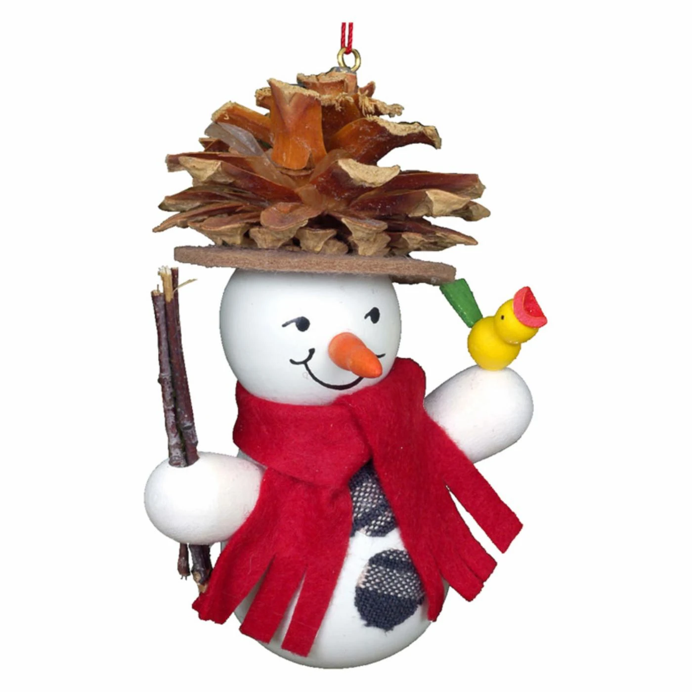 This Christian Ulbricht Snowman Wearing Pinecone Hat Ornament proves that snowmen know how to get festive. Complete with a red scarf, pinecone hat, and singing winged friend, this ornament was handcrafted in Germany from solid wood.
