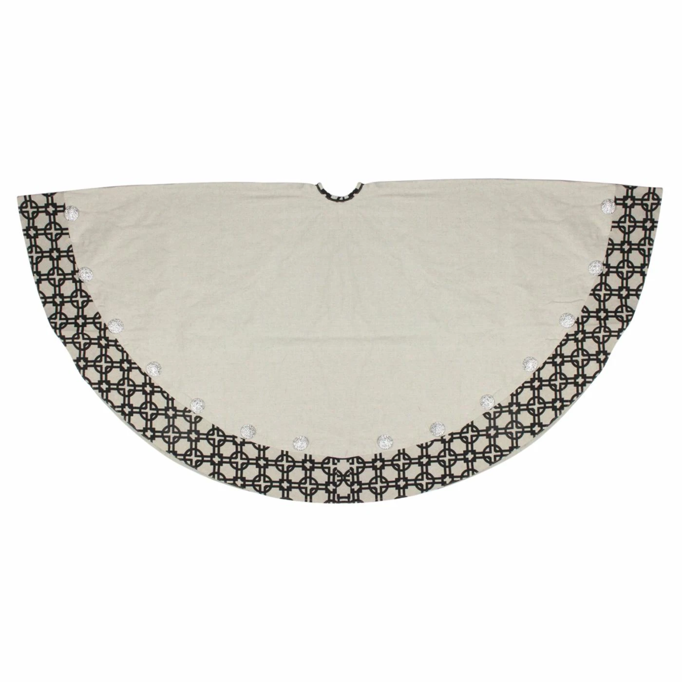 Rhinestone buttons lend a glamorous sparkle to the Allstate 54 in. Glamour Time Rhinestone Christmas Tree Skirt. The burlap and polyester tree skirt features a black and beige geometric border that makes a modern statement.