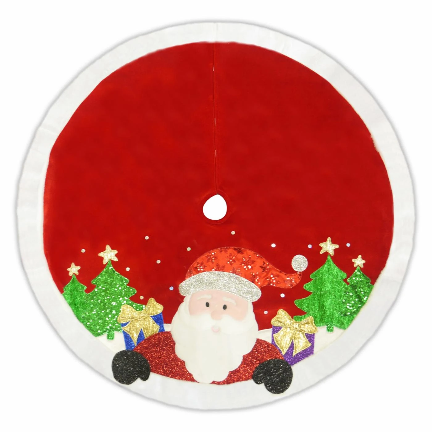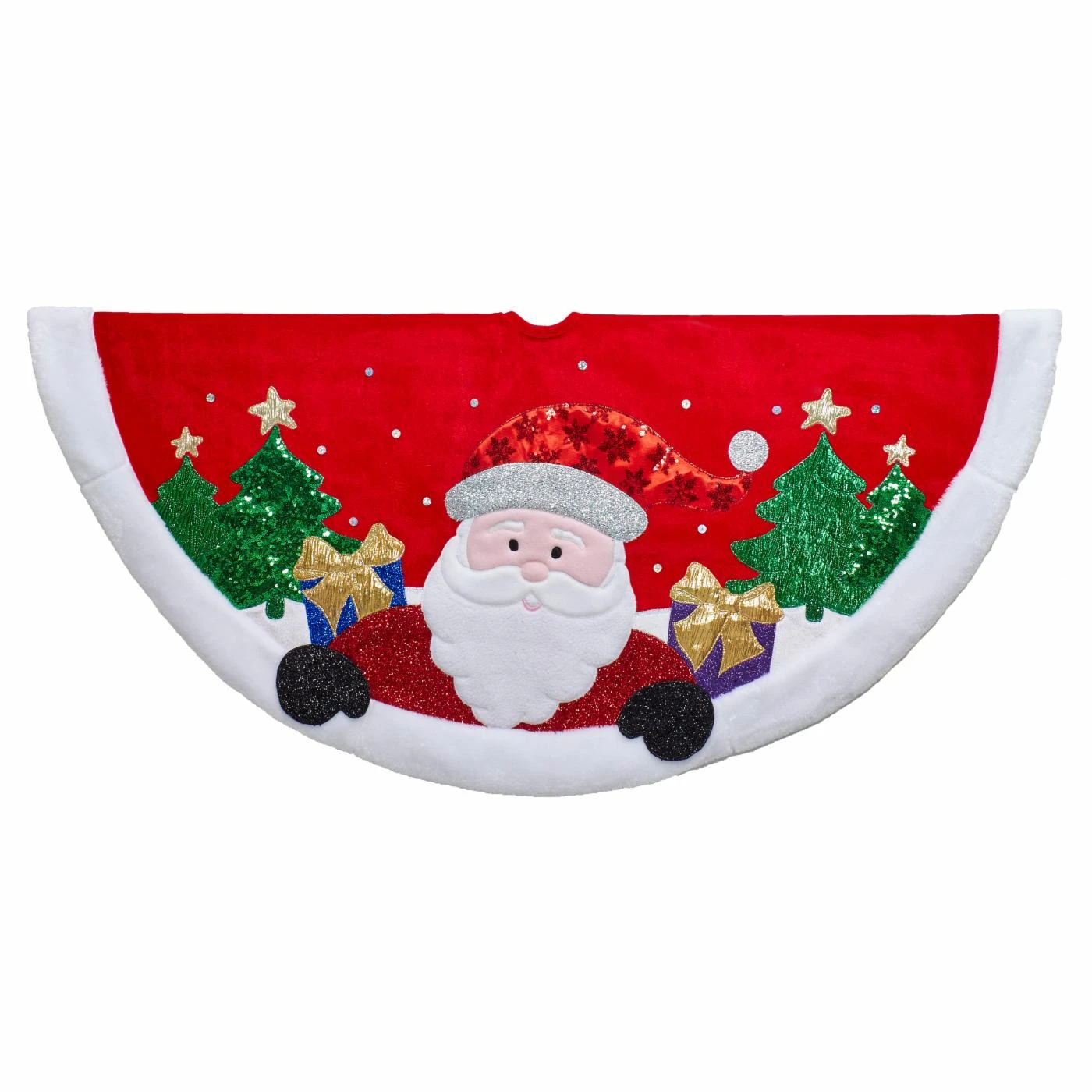 Santa’s arrived a little early on the Kurt Adler 48 in. Red and White Applique Santa Tree Skirt. An endearing Santa Claus applique welcomes friends and family to find their gifts under the tree. The bright red fabric adds a vibrant finishing touch to your Christmas tree.