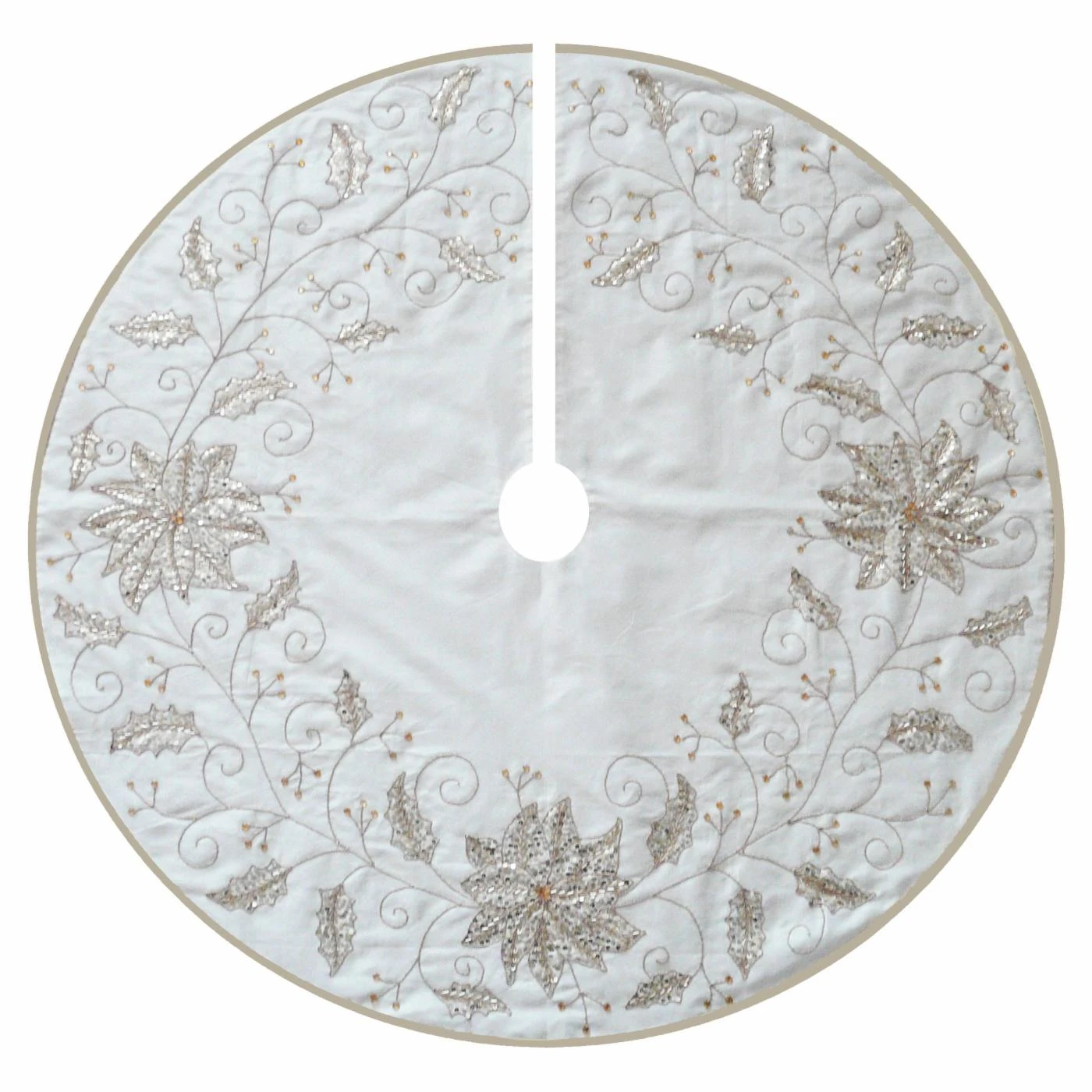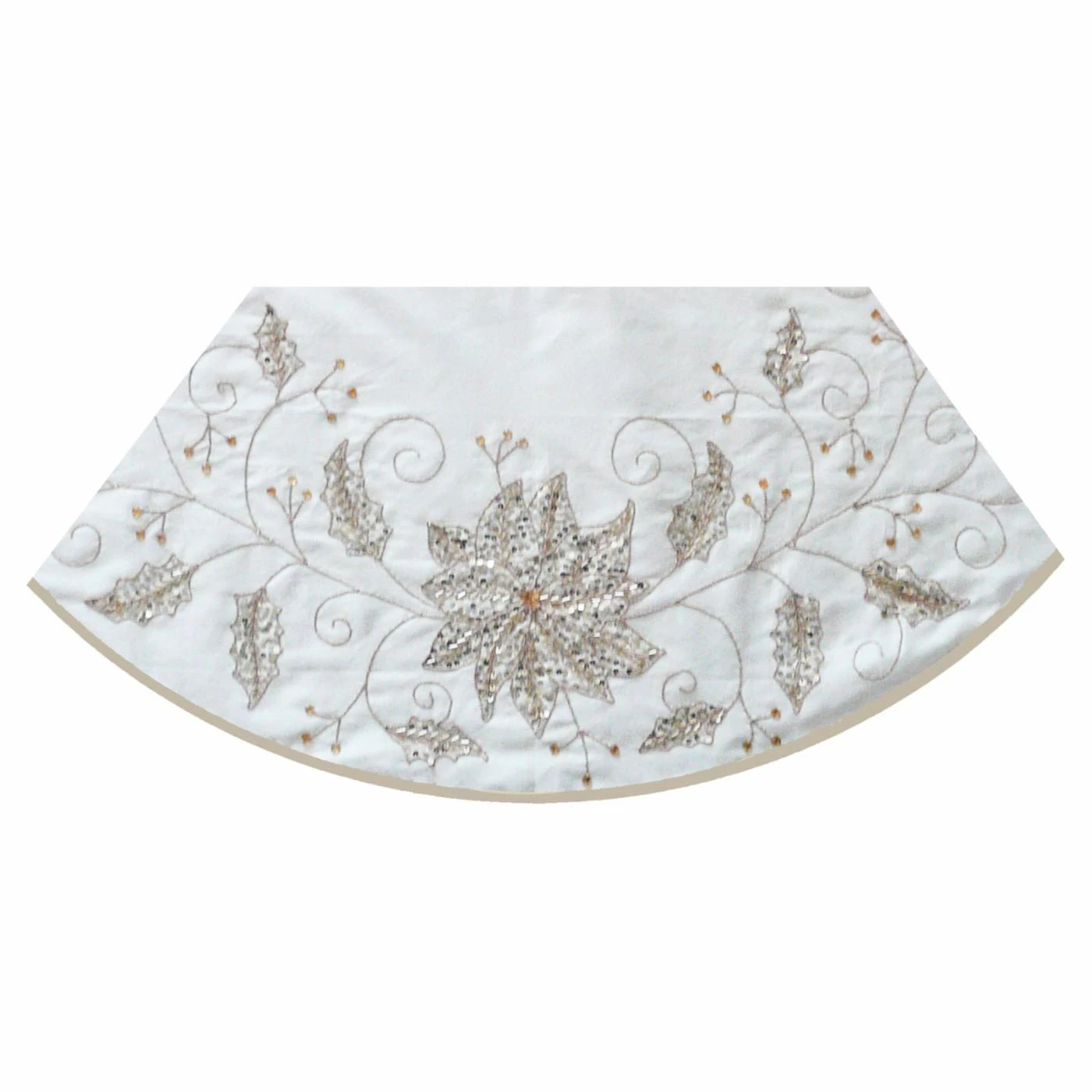 You’ll feel like something is missing on your Christmas tree until you add the Kurt Adler 54 in. Ivory Holly Tree Skirt as a finishing touch. This tree skirt is made of ivory polyester fabric with beautiful and intricate beading in a holly leaf and flower design. Combine this round skirt with any holiday color scheme.