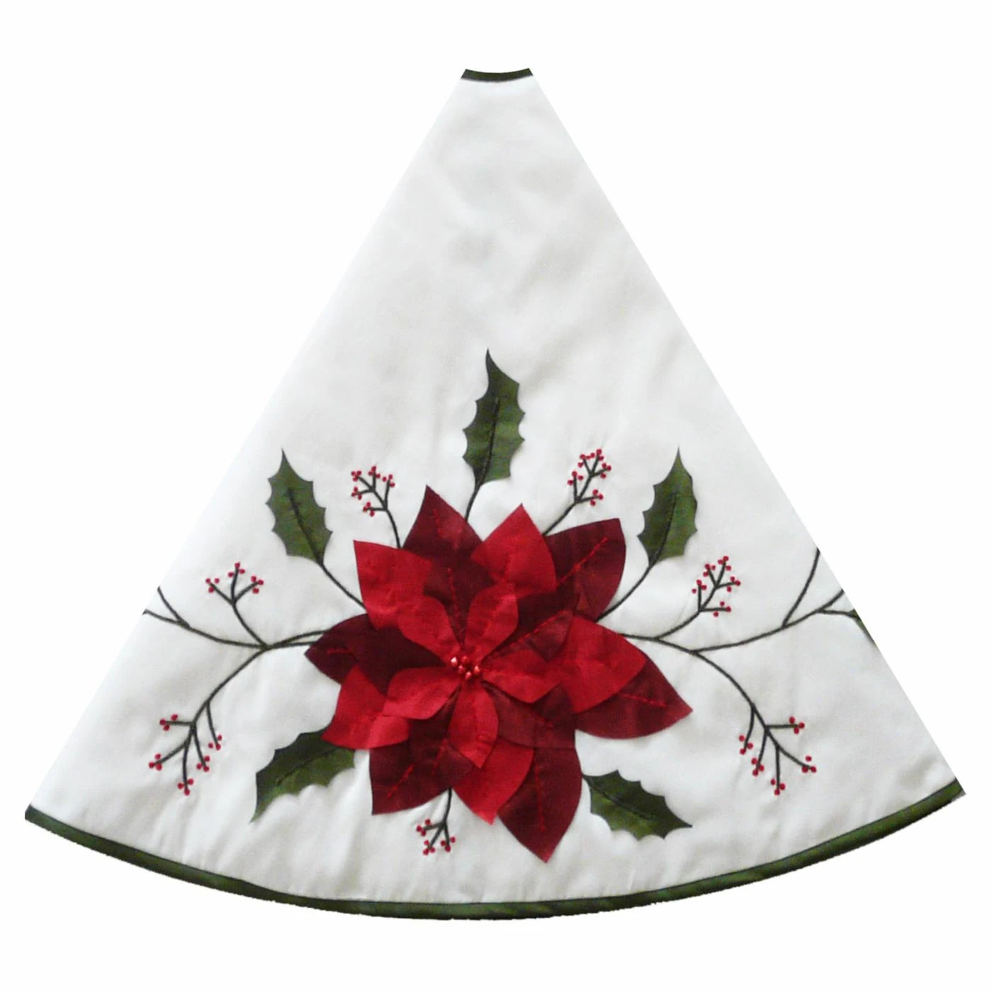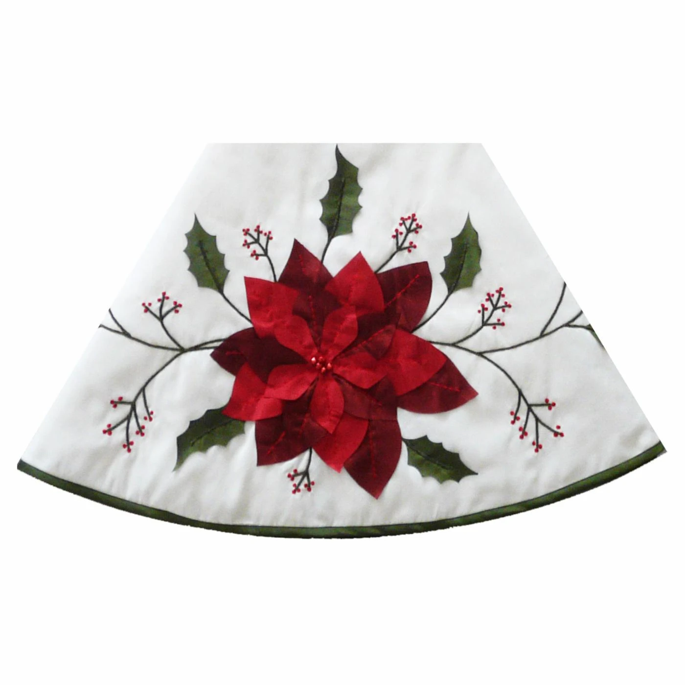 - Appliqued and embroidered bright red poinsettias