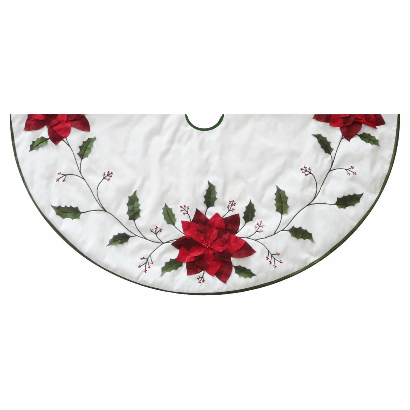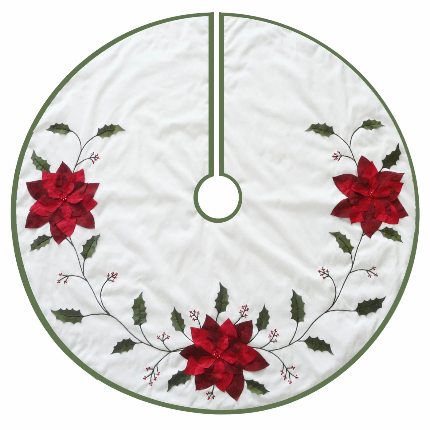 The Kurt Adler 54 in. Ivory with Holly Leaves and Poinsettia Tree Skirt is like a little winter garden beneath your Christmas tree. This round tree skirt is made of a white fabric with bright red poinsettia and dark green holly leaf appliques. A thin green border creates a clean finish.
