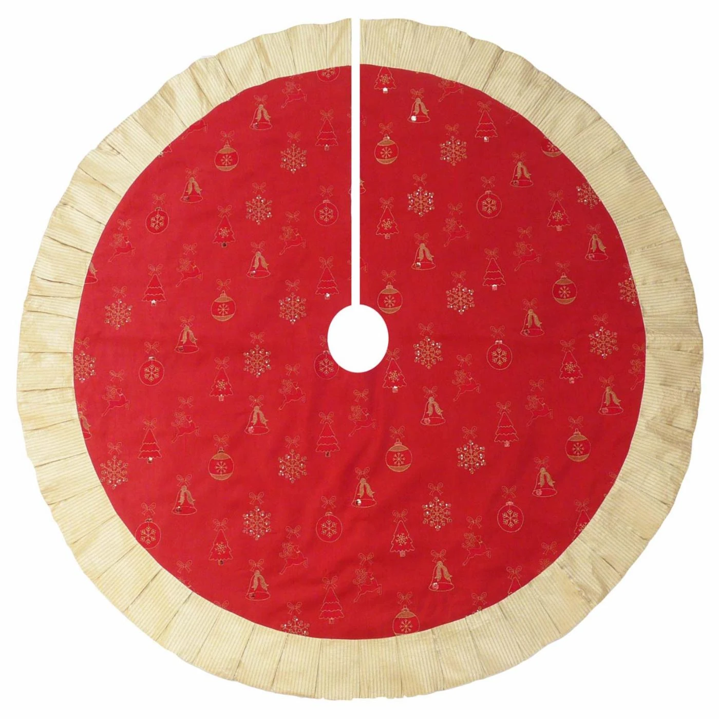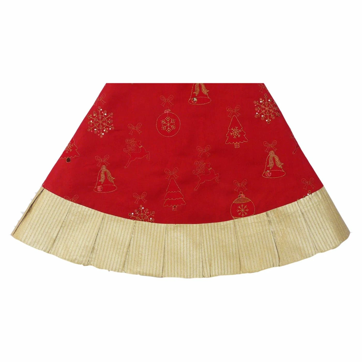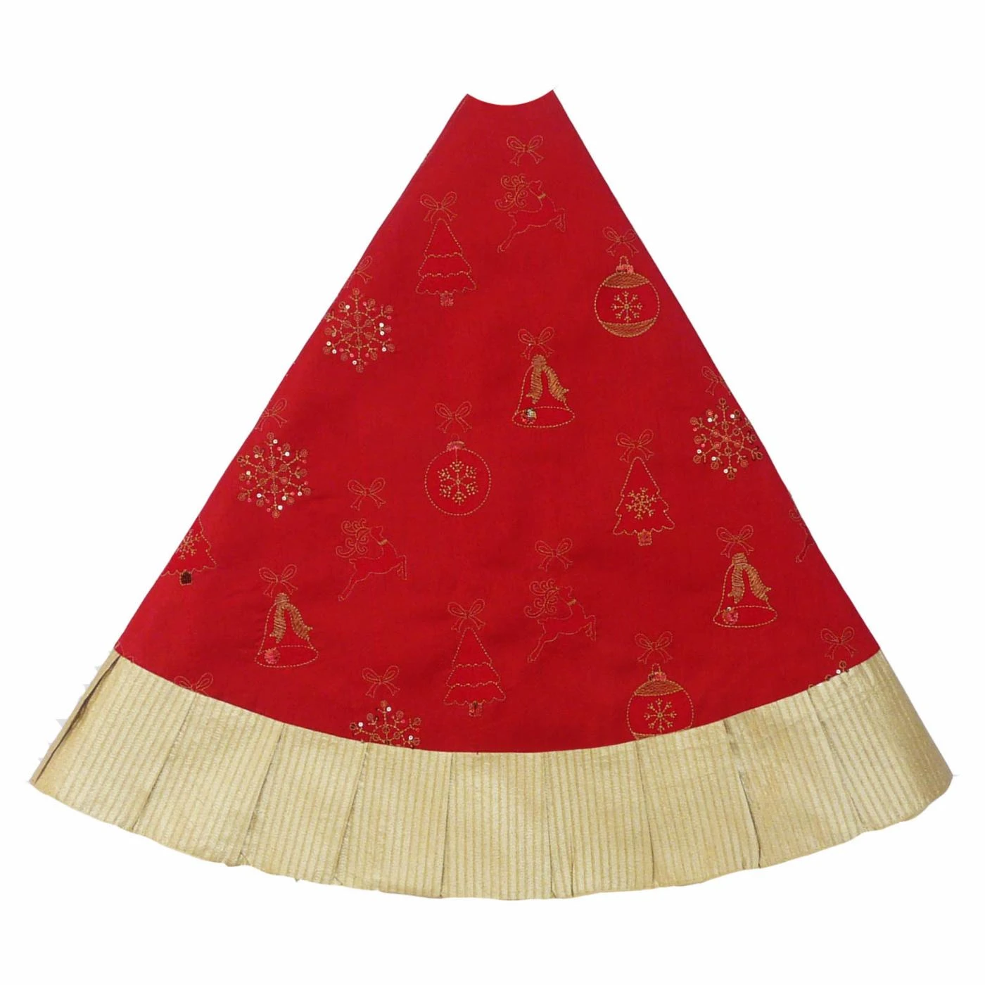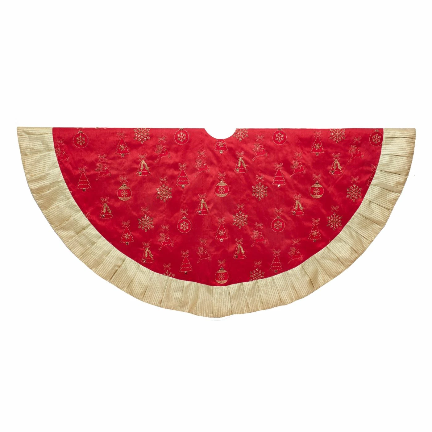 The Kurt Adler 60 in. Red and Gold Ornament Tree Skirt creates a rich, vibrant base for your beautifully decorated holiday tree. This tree skirt is made with bright red fabric decorated in detailed gold beading of different holiday shapes. The border is a pleated gold fabric for a textured finishing touch.