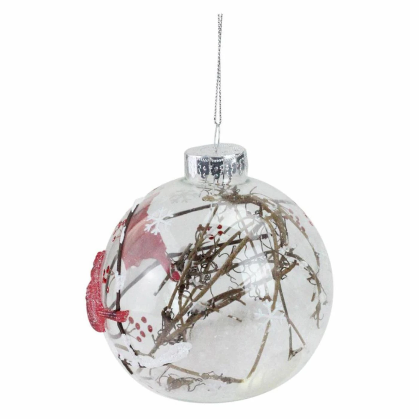 Filled with faux snow and branches, the Northlight Branch and Snow Filled Ball Christmas Ornament with Cardinals brings a dose of winter inspiration to your dΓ©cor. This Christmas ornament is crafted from glass in a classic round shape. It’s adorned with textured bird patterns in a vibrant red finish.