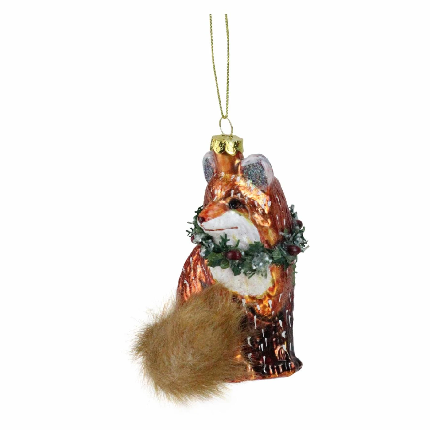 The Northlight Fox with Fur Tail and Wreath Christmas Ornament features a friendly woodland fox adorned with a holly wreath. Made from glass, this Christmas ornament features a glossy sheen that sparkles in your tree’s light.