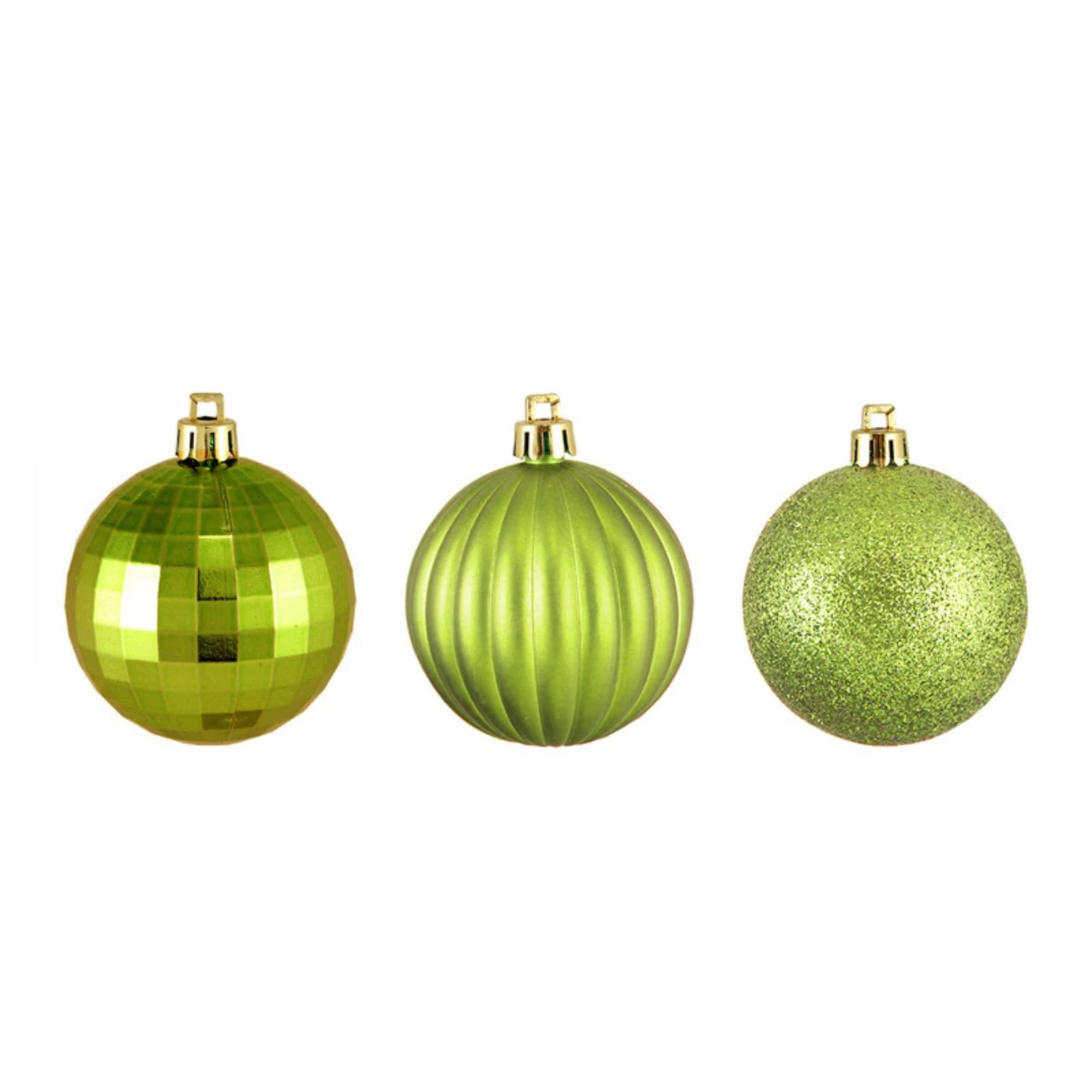Fill your tree with holiday cheer using the Northlight Green Kiwi 3 Finish Christmas Ball Ornaments – Set of 100. Complete with 100 ornaments, this set is crafted from plastic and finished in a bright green color. The balls shaped designs feature textured accents to add subtle glittering style.