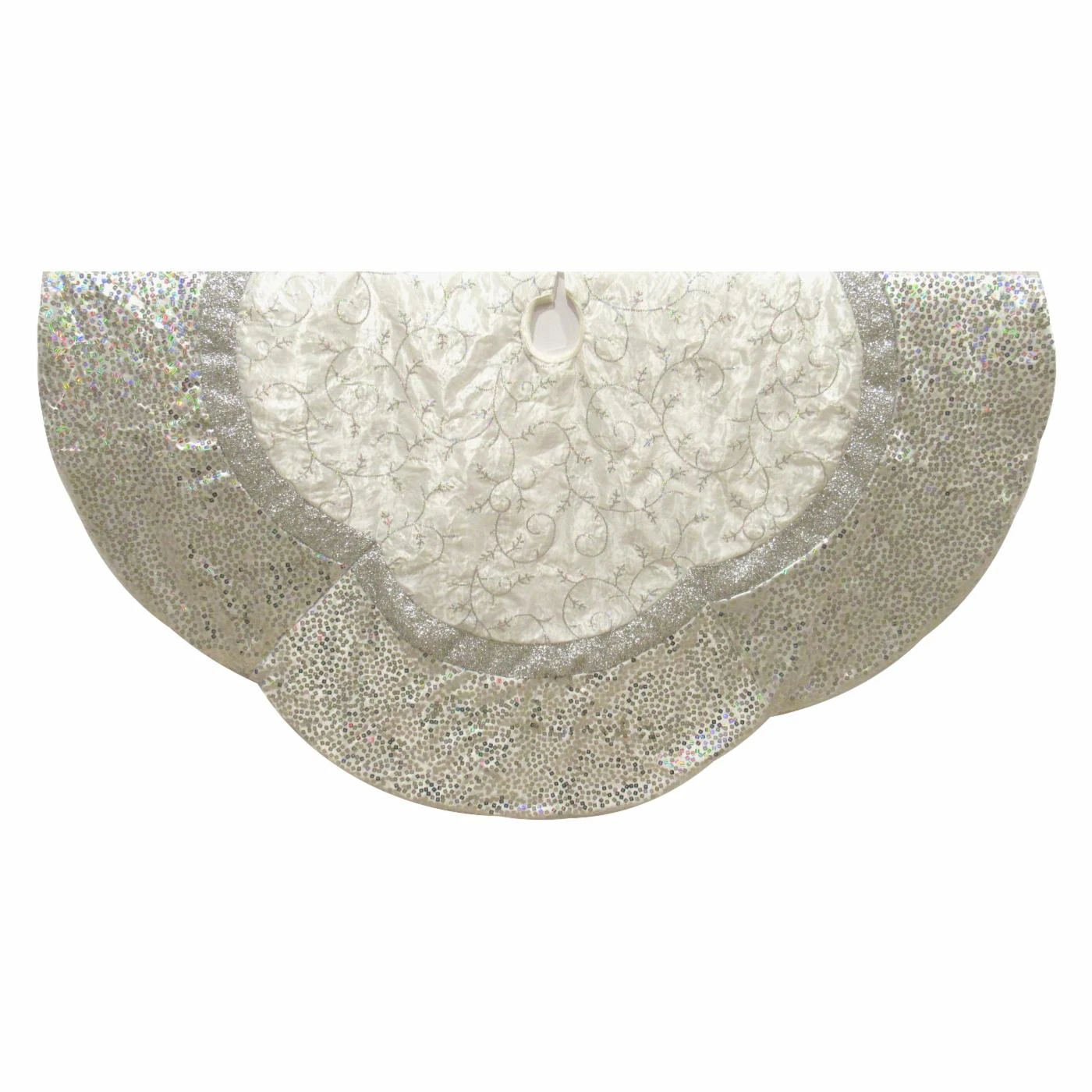 Decorate your Christmas tree in glamorous with the Kurt Adler 60 in. Silver Embroidered Treeskirt. This white and silver tree skirt features a sequin and embroidery detail that catches the light in magnificent ways. A large scallop border reinforces the feminine look of this tree skirt.