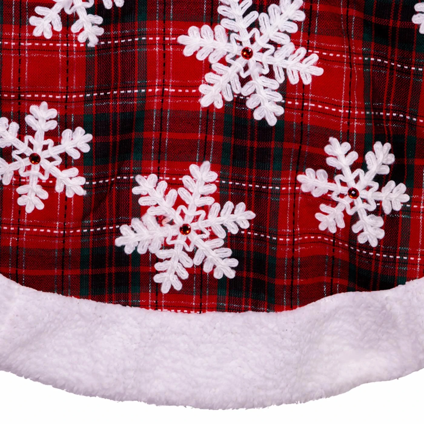 This 48-Inch Plaid with White Snowflake Design Treeskirt from Kurt Adler is a fun and festive addition to any holiday décor. This red plaid treeskirt features a white snowflake design and a white sherpa border. This is a perfect way to decorate your Christmas tree!