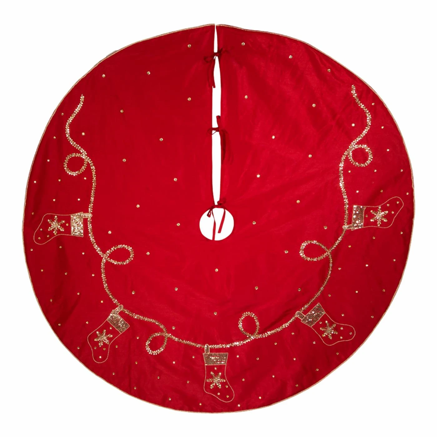 This Kurt Adler 60-Inch Red and Gold Sequin Embroidered Tree Skirt is an elegant way to add to any holiday décor or Christmas tree. This tree skirt is made of polyester and it features a red background with a beautiful pattern of gold sequined Christmas stocking designs and a smooth border.