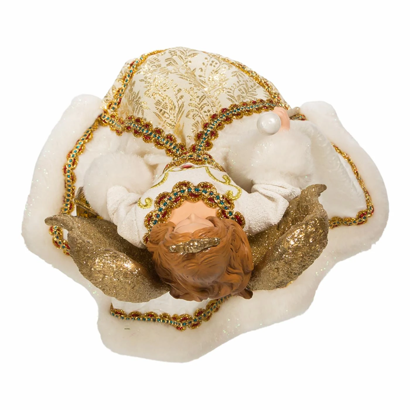 Kurt Adlers jeweled white and gold angel treetop is a beautiful addition to your holiday décor or Christmas tree. This angel is wearing a beautiful white and gold dress, with a red gemstone accent and he has gold glittered wings. In one hand she is holding a gold glittered lantern with multicolor gemstones and in the other she holds a gold glittered staff.