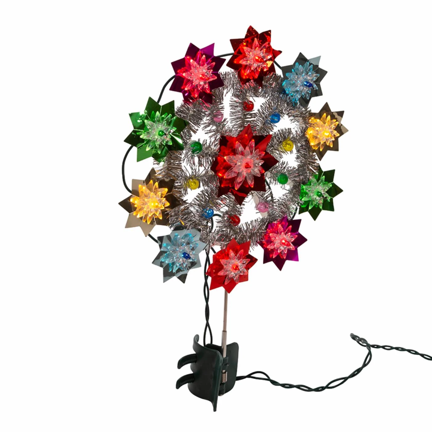 This 11-Inch 11-Light Multi-Color Retro Reflector Treetop from Kurt Adler is the perfect addition to any holiday home dΓ©cor. This treetop boasts 11 multiple colored lights on a green wire with a 72 inch lead and a clip holder to attach itself to your tree. The perfect addition to any holiday tree decor!