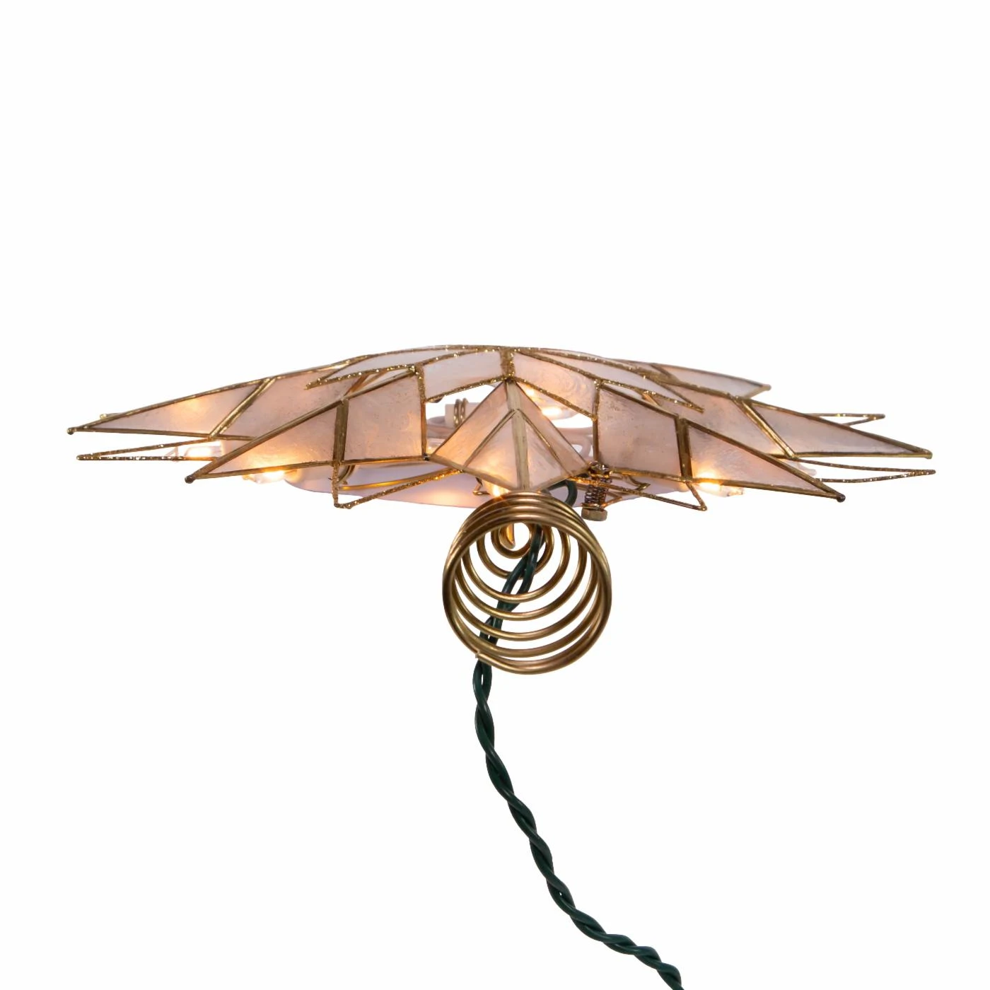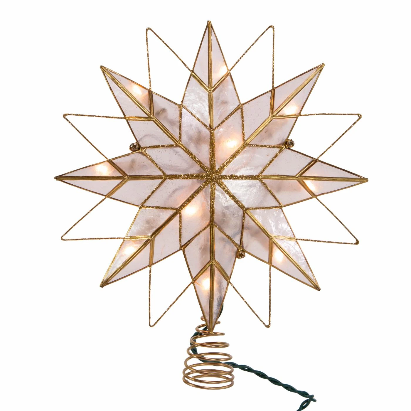 This 9.65-Inch UL 10-Light 8-Point Capiz Star Lighted Treetop from Kurt Adler is a beautiful and festive addition to any holiday home decor. This 10 light treetop features an 8 point star made of capiz, decorated in gold with a spiral bottom to attach to your tree. The perfect way to add a brightness to any holiday tree!
