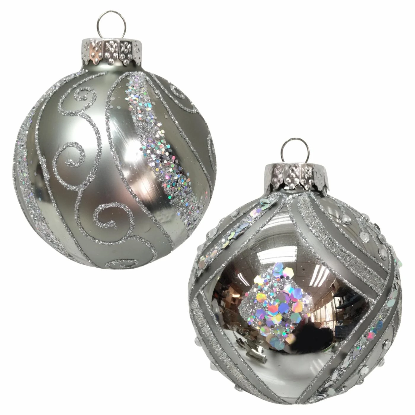 - Silver glitter and sequins; matte and shiny silver finishes
