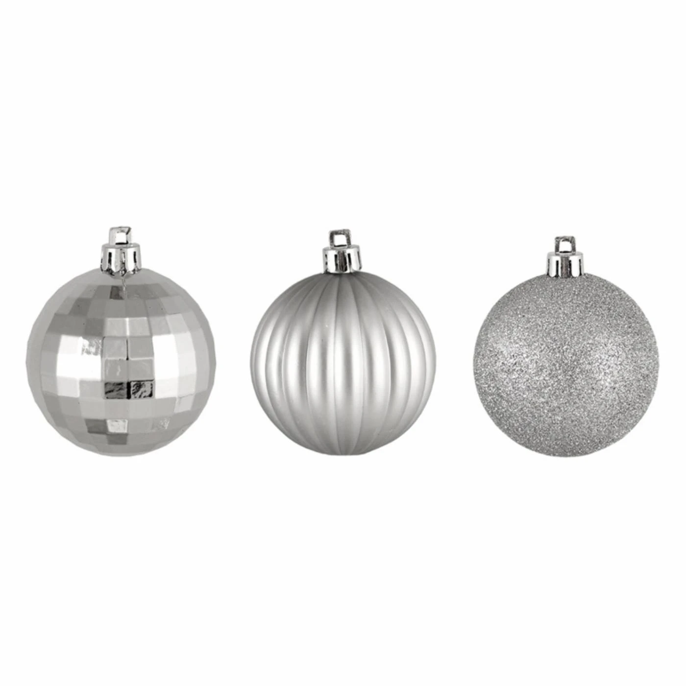 Brilliant silver finishing lends a sophisticated, yet festive touch to the Northlight Silver Splendor 3 Finish Shatterproof Christmas Ball Ornament – Set of 100. The plastic design is conveniently shatterproof. Metal tabs at the top provide a secure base for tying them onto your tree.