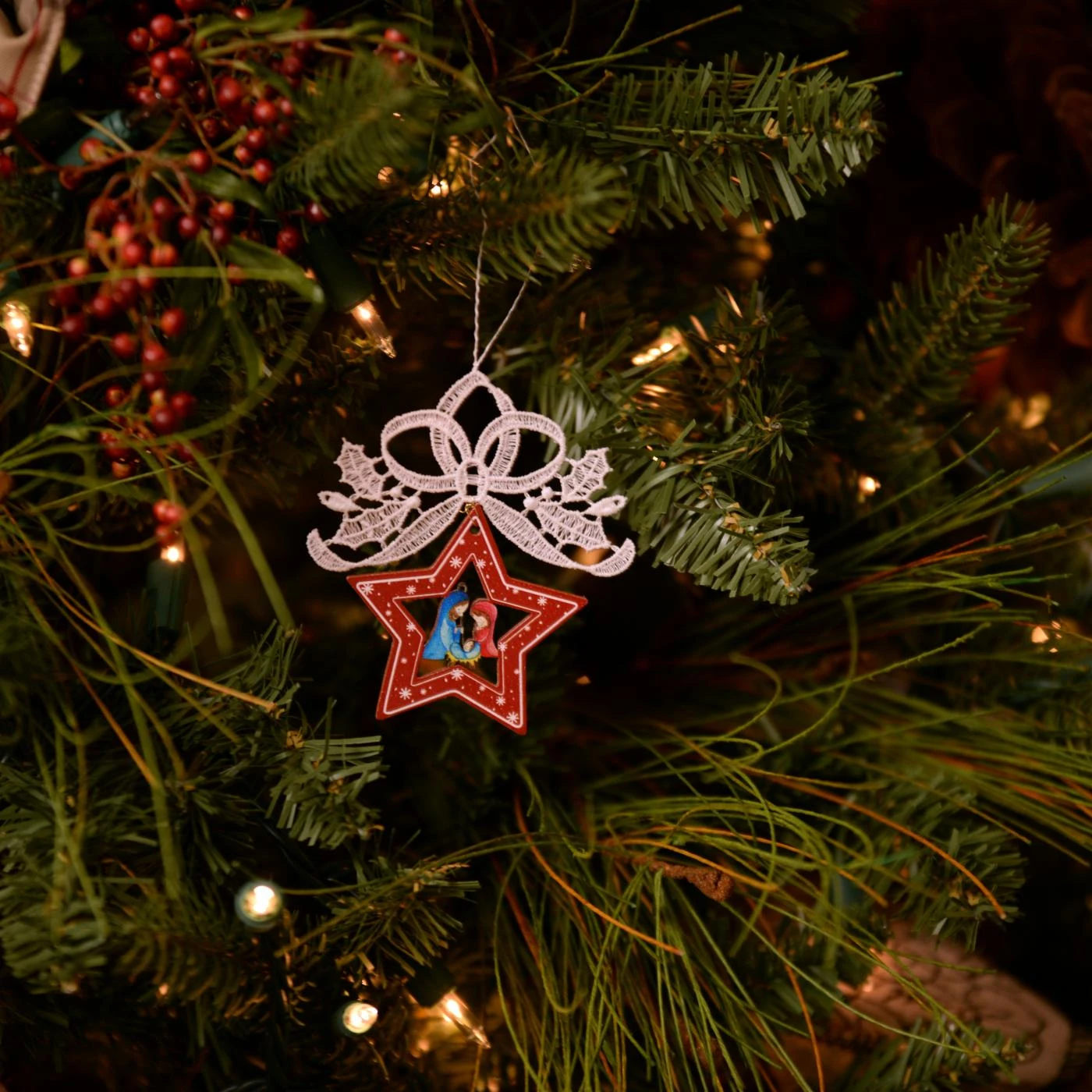 An intricate wood and lace construction contributes to the Heritage Lace Star and Holy Family Ornament – Set of 2 being replete with classic appeal. Add these ornaments to garlands, trees, wreaths, and presents for a festive touch befitting the season.