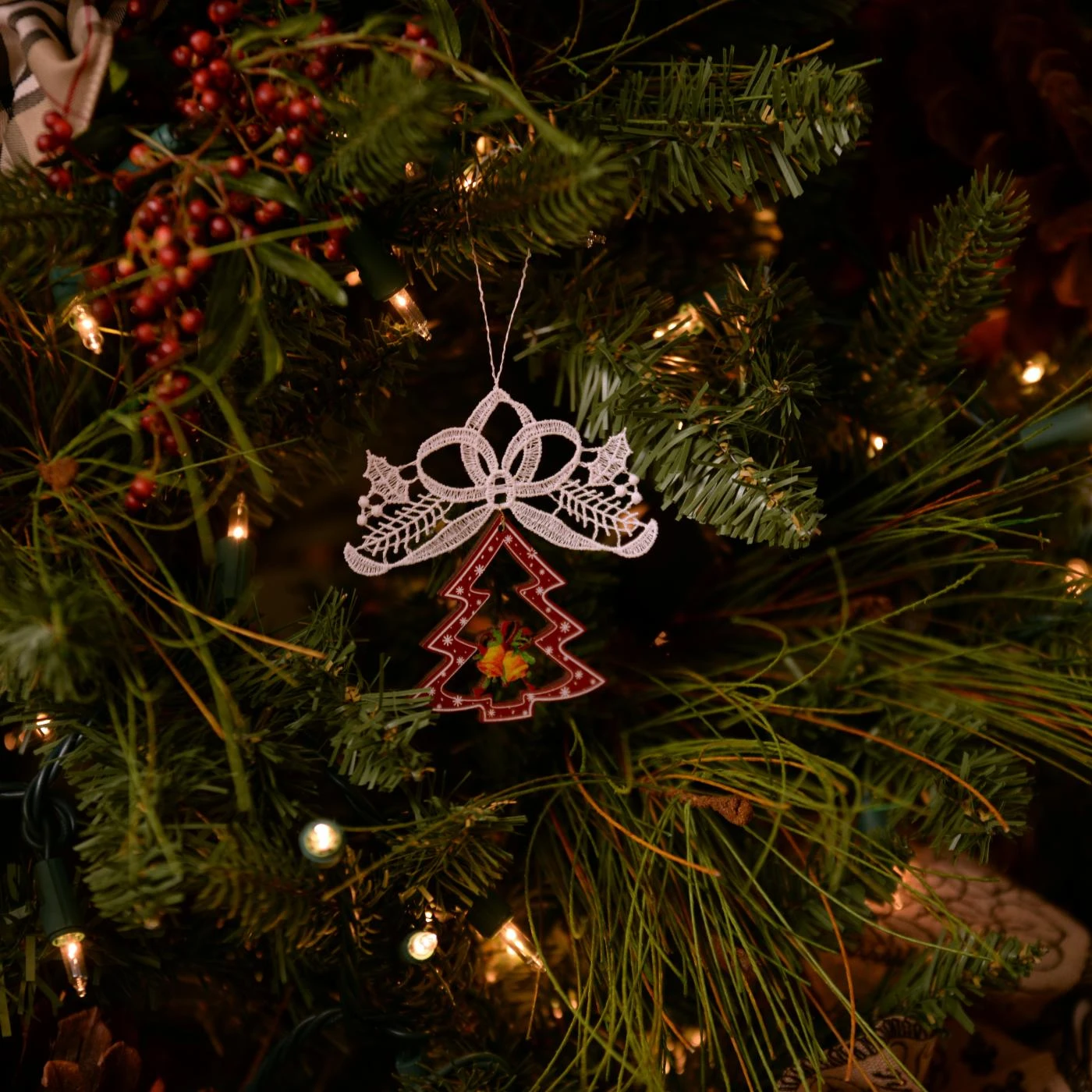 A colorful tree, bell, and bow motif lends the Heritage Lace Tree and Bells Ornament – Set of 2 festive appeal befitting the season. These ornaments feature a wood and polyester lace construction in red, white, green, and yellow hues. Add them to presents, trees, garlands, and wreaths for a charming finishing touch.