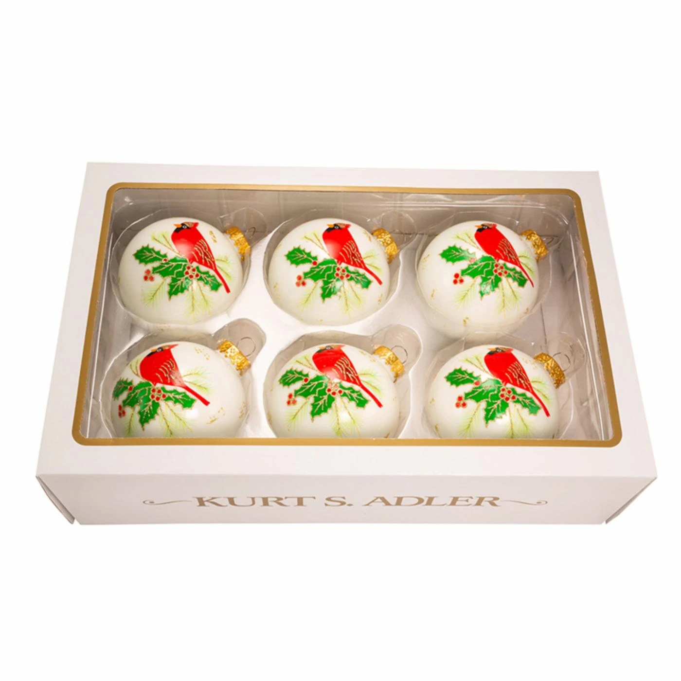 Bring a touch of nature to your holiday tree with the Kurt S. Adler White with Cardinal Ball Ornaments – Set of 6. Each ornament is enlivened with a charming red cardinal perched on green and red holly branches. This shimmering, sweet set of six ball ornaments features a white finish that stands out on any tree or garland.