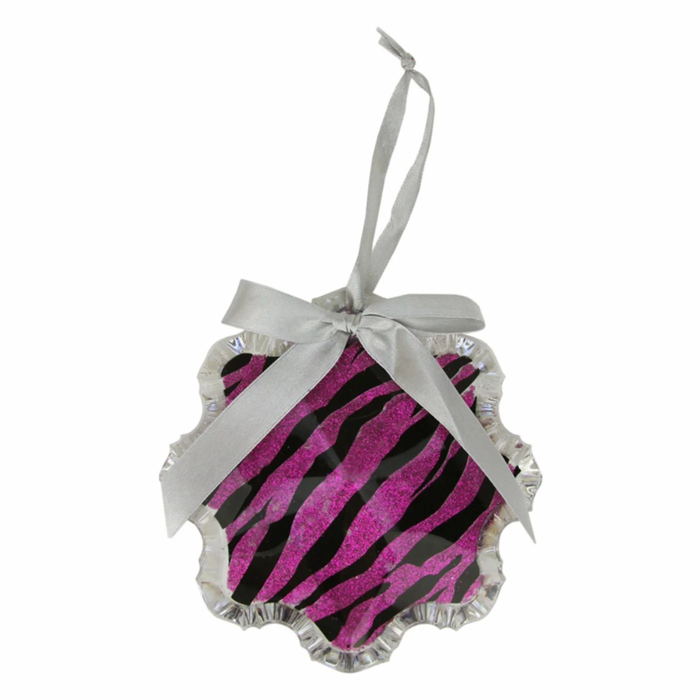 The Allstate 4.5 Glittered Zebra Print Snowflake Christmas Ornament features a magenta and black zebra stripe pattern that’s sure to attract second glances. This Christmas ornament is framed by a scalloped border and topped by a coordinating ribbon.