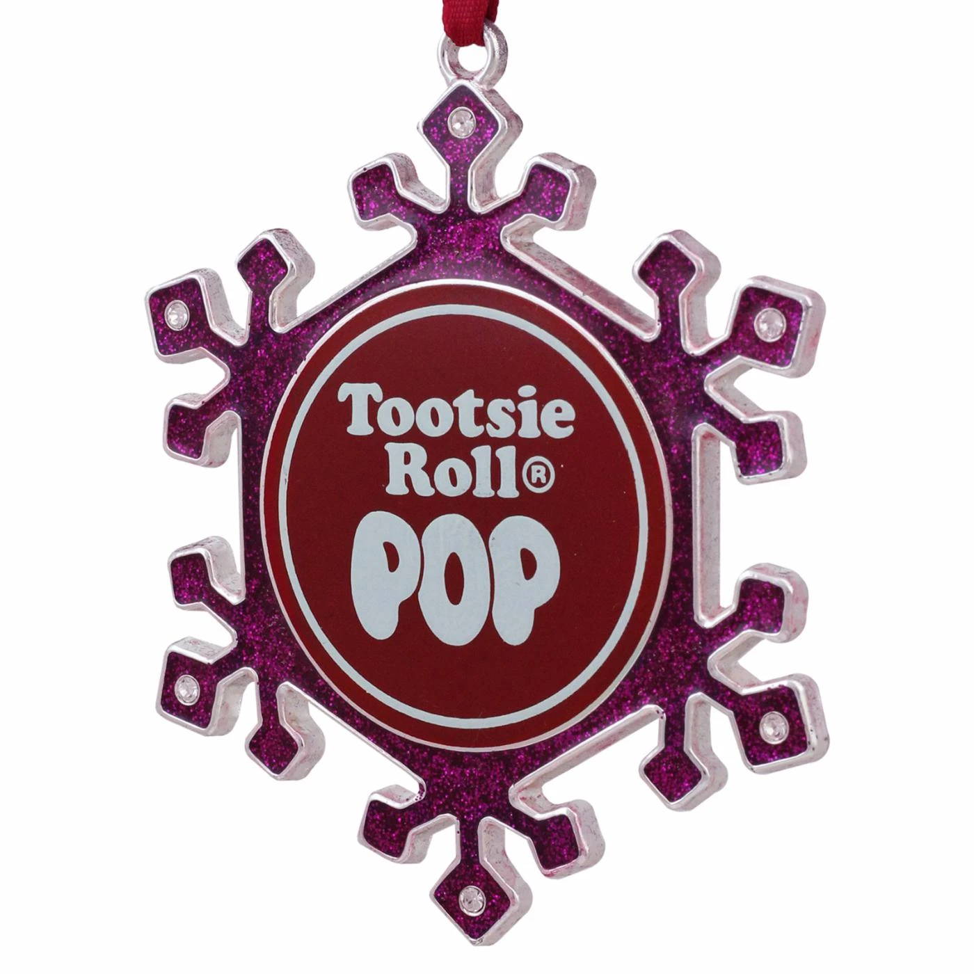 Add a sweet treat to your tree with the Northlight 3.5 in. Silver Plated Tootsie Roll Pop Candy Christmas Ornament, accented with the classic Tootsie Roll Pop logo in the center. Made of metal in a snowflake shape, this delectable ornament is accented with bright purple and red glittering hues.