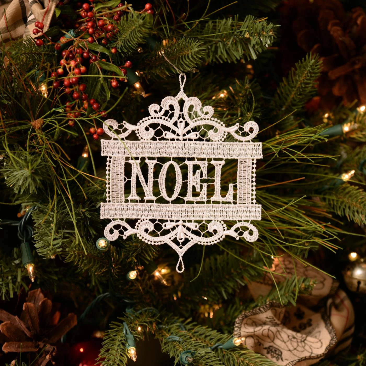 A macrame lace design in white lends the Heritage Lace Noel Ornament – Set of 2 classic elegance. These ornaments feature a noel text with a decorative border, making them a festive addition to trees, garlands, wreaths, and presents.