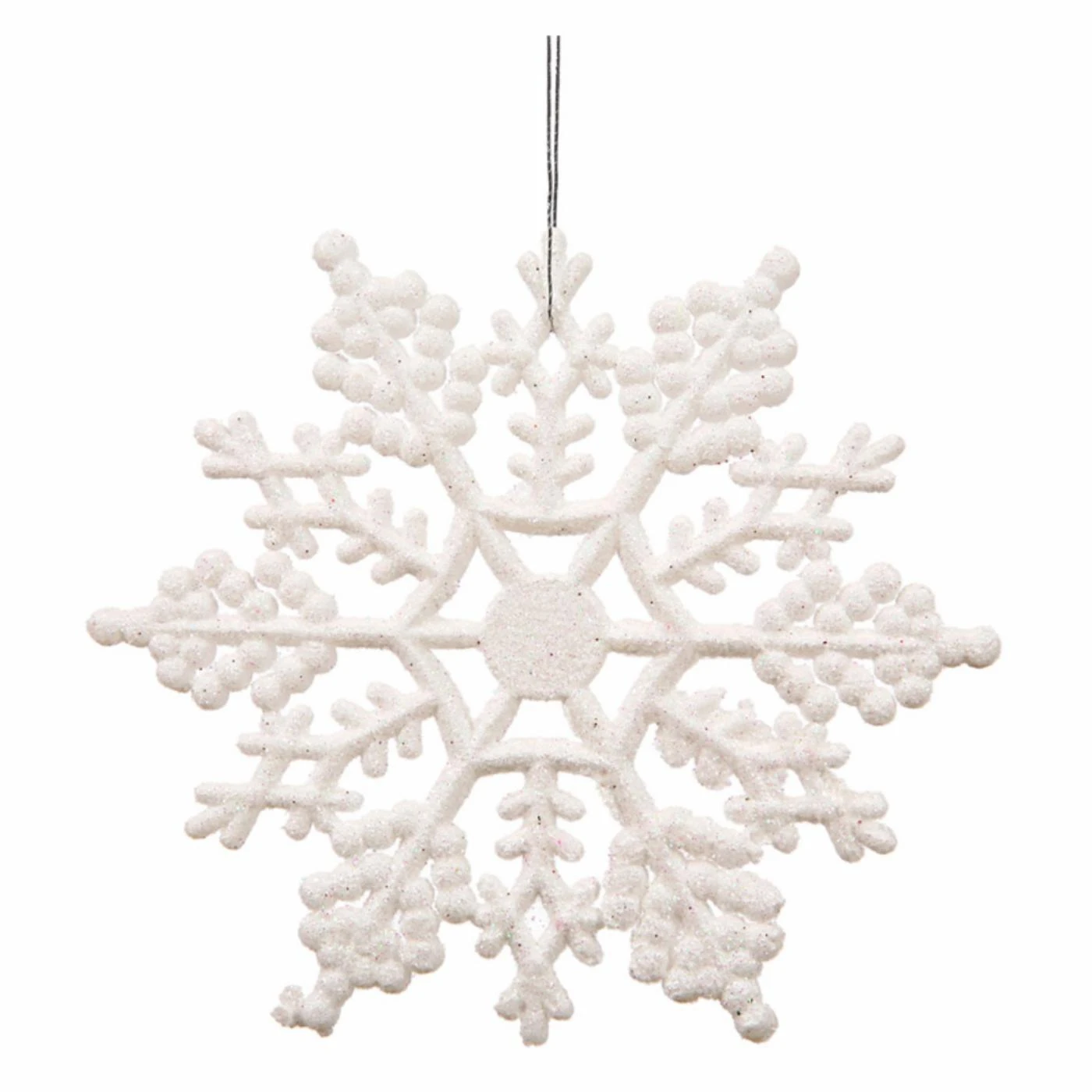 Add a glittery snowstorm of fun to your Christmas tree this year with the Vickerman 6.25 in. White Glitter Snowflake – Set of 12. Included are 12 delicate-looking (yet durable) snowflakes made of plastic with sparkling white glitter. These decorations are flat, come ready to hang, and also make perfect gift toppers.