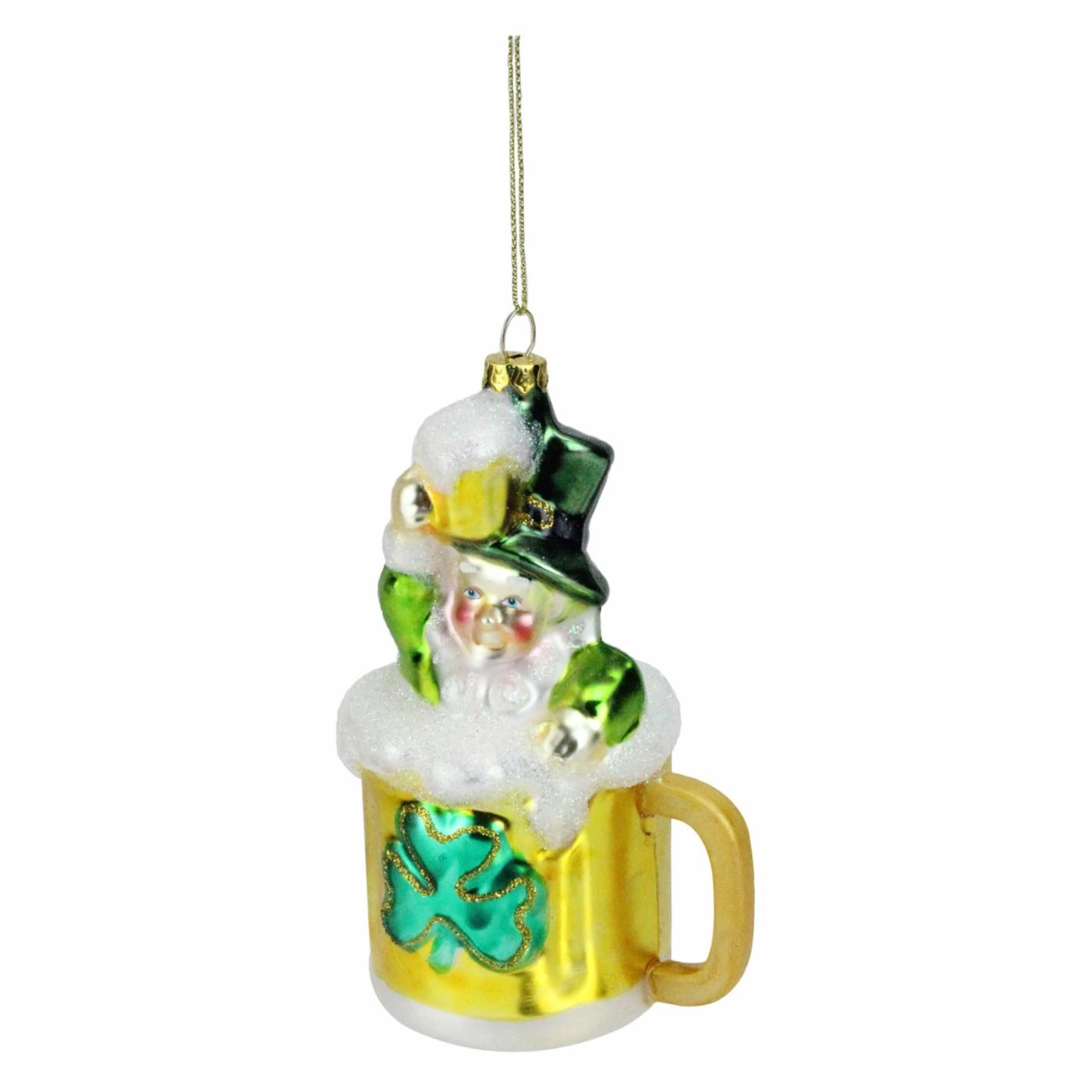 Finished in shades of gold and green, the Northlight Luck of the Irish Leprechaun and Gold Beer Mug Christmas Ornament has a shimmering look that’s brimming with visual charm. This Christmas ornament is made from glass and has a traditional eyelet cap that works well with strings and hooks.